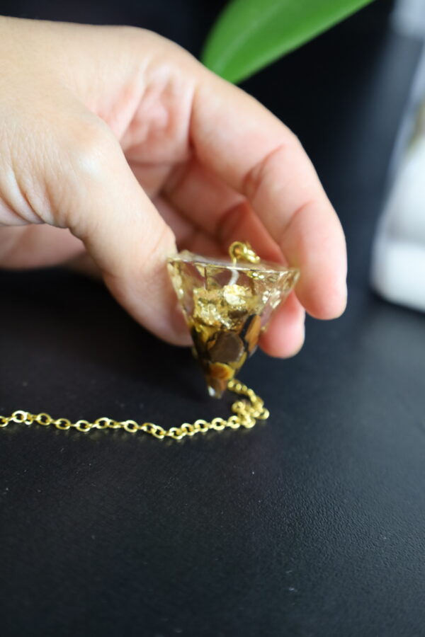 Pendule en Œil de Tigre entièrement artisanal, décoré de dorures représentant une lune et une feuille. Chaque pièce est unique et impossible à reproduire, offrant un outil divinatoire puissant, protecteur et chargé d’intuition. Idéal pour la radiesthésie, les rituels lunaires et le travail énergétique.